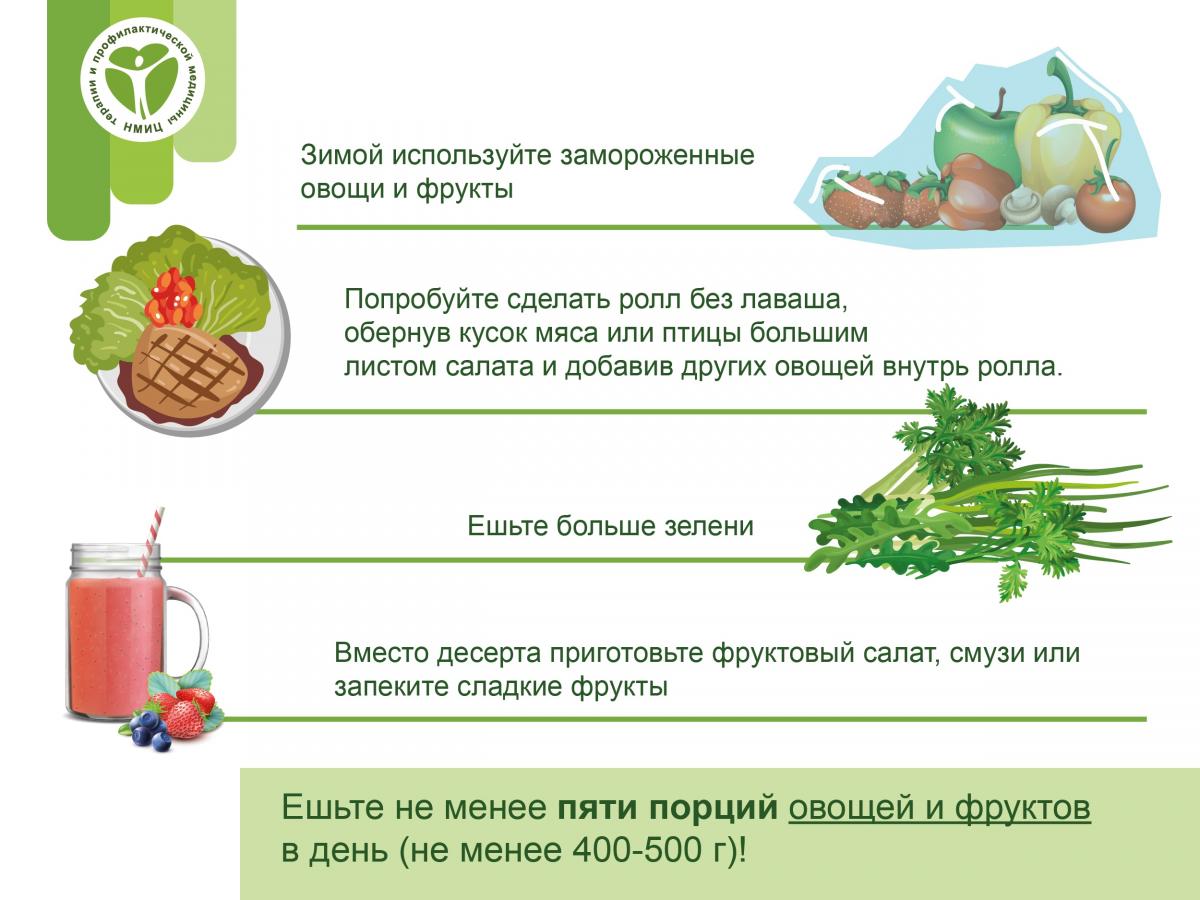 - потребление овощей и фруктов не менее 400-500 граммов в день